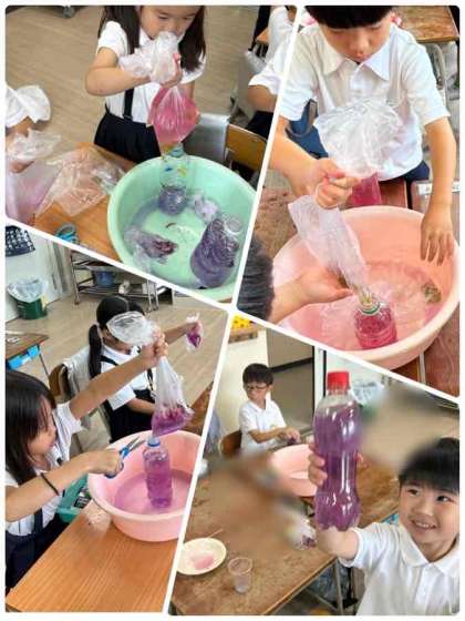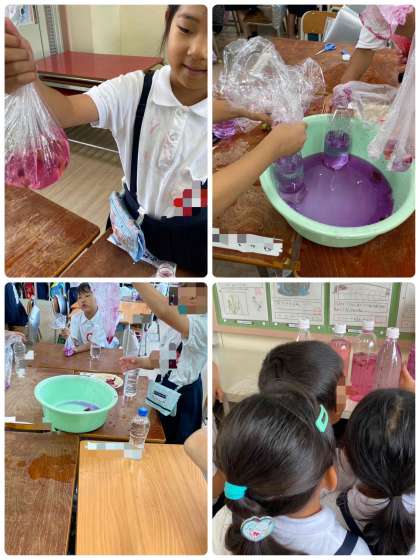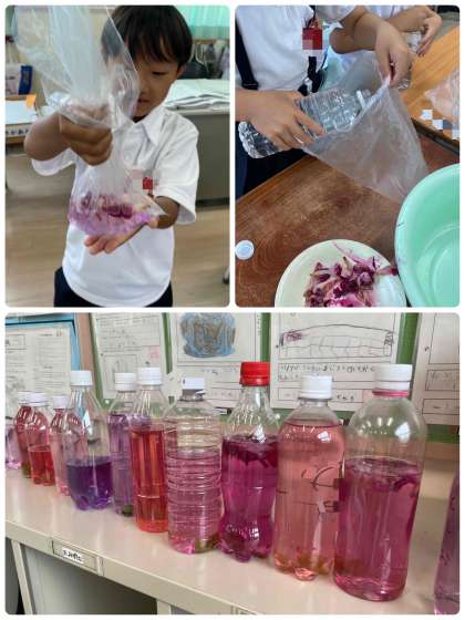 アサガオの花で色水を作りました。しぼんだ花を毎日摘んで集めていたものと水を少し、ビニル袋に入れて、手でもみました。みるみるうちに水が赤色や紫色に染まり、きれい〜!と声があがりました。そこに、運動場にできていた緑色のぶどうをつぶして入れると、あら不思議!赤や紫の色水がピンク色に染まりました!実験みたい!色が変わるなんて!と大興奮の1年生でした。