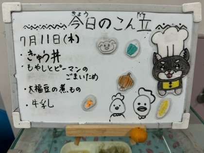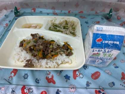 今日の給食は「牛丼・もやしとピーマンのごまいため・大福豆(おおふくまめ)の煮もの・牛乳」です。