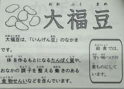 今日は「大福豆の煮もの」が登場しました。不足しがちな食物せんいがとれるように、給食ではいろいろな豆類が登場します。大福豆は、甘納豆、煮豆、和菓子などに使われる豆です。甘い味つけで、やわらかに煮えていました。