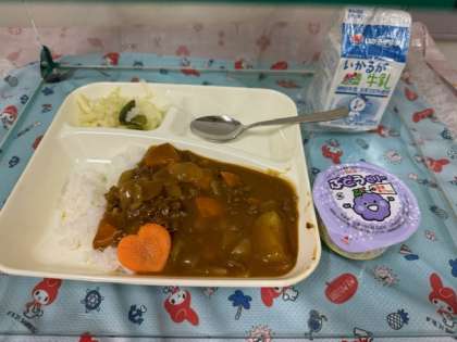 今日の給食は、「ビーフカレーライス・野菜のピクルス・ぶどうゼリー・牛乳」です。
