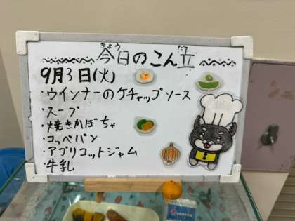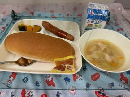 今日の給食は、「フランクフルトのケチャップソース・スープ・焼きかぼちゃ・コッペパン・アプリコットジャム・牛乳」です。