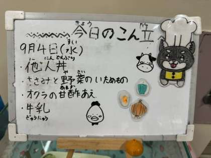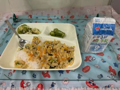 今日の給食は「他人丼・ささみと野菜のいためもの・オクラの甘酢あえ・牛乳」です。