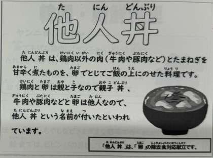 他人丼は、東日本では「豚肉」、西日本では「牛肉」を使うことが多いです。甘辛く味付けされて卵でとじられた他人丼は、子どもたちに大好評でした。