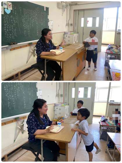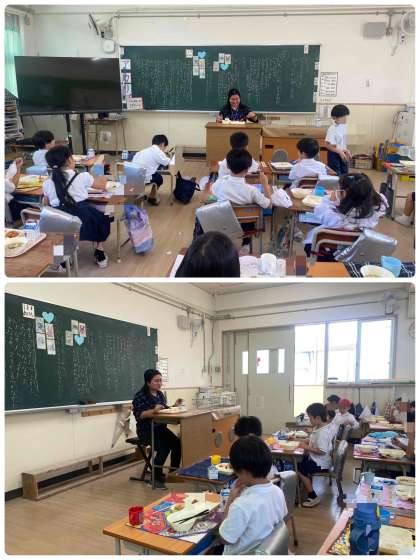 C-NETの先生が1組の教室に給食を食べに来ました。朝からどんな先生が来てくれるのかわくわくして、職員室に会いに行く子もいました。初めは緊張していましたが、慣れるとたくさん質問していました。ごちそうさまの代わりに「Thank you for the food.」と言ってごちそうさまをしました。