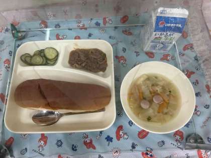 です。ソースで煮込まれた牛肉に、ウインナーたっぷり入ったスープに、満足した表情で美味しく給食をいただいています。