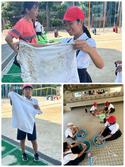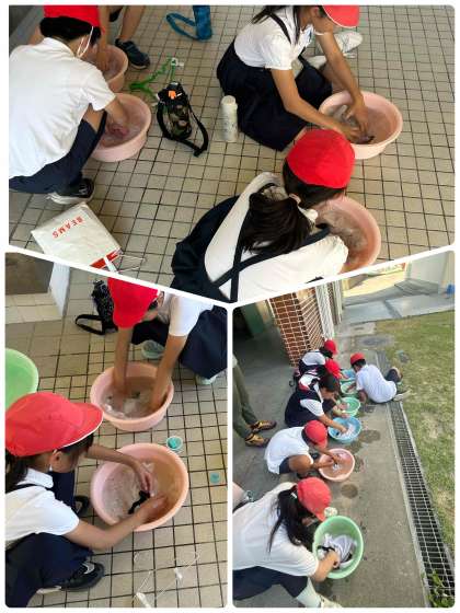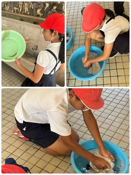 洗濯実習をしていました。汚れた体操服を手洗いで汚れを落としました。普段してもらっている洗濯に感謝の気持ちも持てたようですし、洗濯機のありがたみもよくわかったようです。