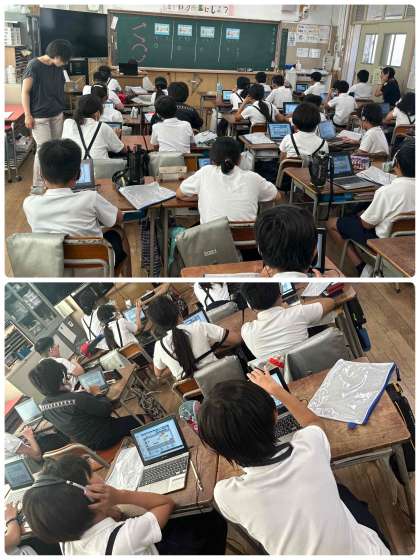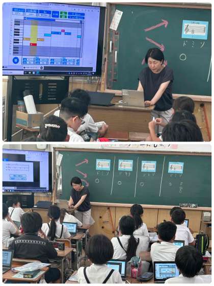 一人一台学習用端末を使って、音楽づくりにチャレンジしていました。自分でつくった音楽をヘッドホンで聴いて確かめています。出来上がった作品は教室の前の大型モニターで共有しています。また出来上がった作品は楽譜にも変換することができます。