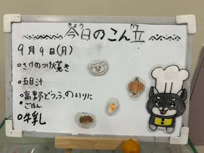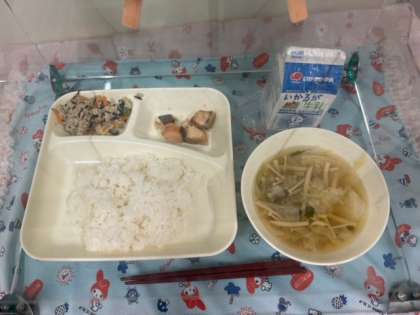 今日の給食は「さけのつけ焼き・五目汁・高野どうふのいり煮・ごはん・牛乳」です。