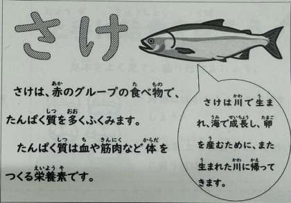 今日の「さけのつけ焼き」は角切りのさけに料理酒と砂糖、こいくちしょうゆで味をつけてから焼いています。甘辛いしょうゆ味でごはんがすすみました。