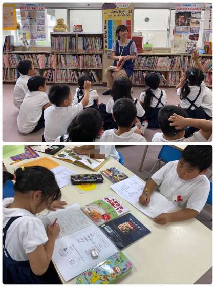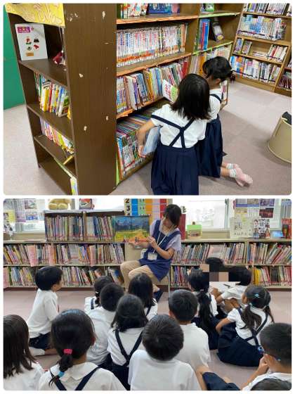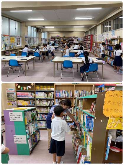 1年生は、いつも図書の時間を楽しみにしています。いつも季節に関した本を読み聞かせがあるので、ワクワクします。読んだ本を読書カードに記録し、「たくさん読んだよ!」「次の紙ほしい」「2学期は、もっとたくさん読もう」など、意欲的に読書に取り組んでいます。