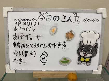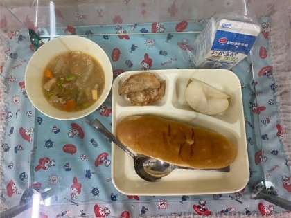 今日の給食は「あげぎょうざ・鶏肉ととうがんの中華煮・なし(豊水)・おさつパン・牛乳」です。
