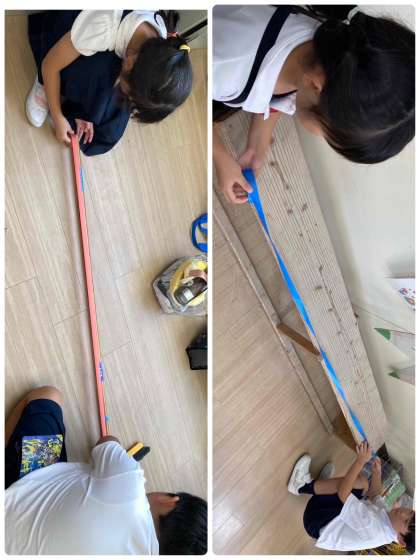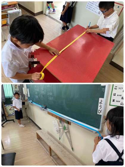 「どちらがながい」の学習で、長さの学習をしています。はしをそろえて長さを比べたり、テープに長さをうつしとって比べたりしています。お家でも、長さ比べをしてみてください。