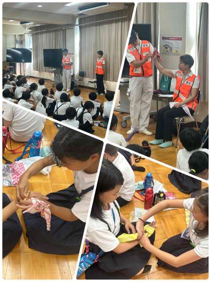 5時間目、日本赤十字社の方を講師にむかえて、身の回りの物でできるケガの手当てなどについて学びました。