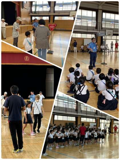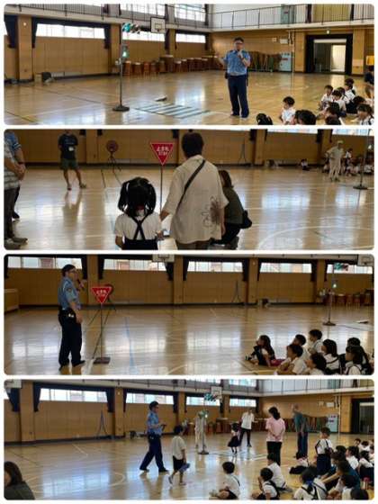 1年生・2年生は、模擬交差点を使い道路の正しい歩き方と道路横断の仕方を学びました。シニアクラブの皆様に手を引かれ、「とまれの標識では左右の安全確認をしっかりしますよ」などとわかりやすく指導をしていただきました。