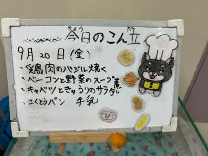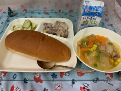 今日の給食は「鶏肉のバジル焼き・ベーコンと野菜のスープ煮・キャベツときゅうりのサラダ・パン・牛乳」です。