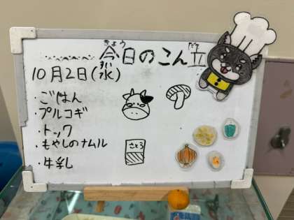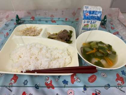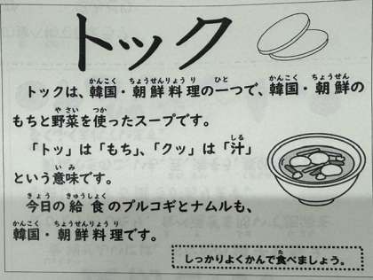 今日の給食は韓国・朝鮮料理の登場です。「プルコギ・トック・もやしのナムル・ごはん・牛乳」です。