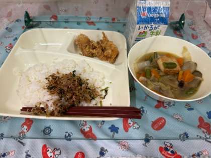 今日の給食は「鶏肉のたつたあげ・あつあげと野菜の煮もの・おかかなっ葉・ごはん・牛乳」です。