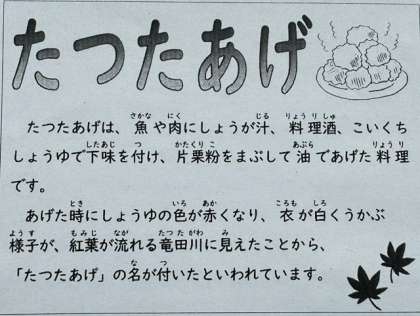 今日は子どもたちに人気の「鶏肉のたつたあげ」でした。しょうが汁、料理酒、こいくちしょうゆで鶏肉に下味をつけて、片栗粉をまぶし油で揚げています。