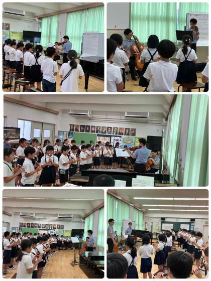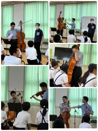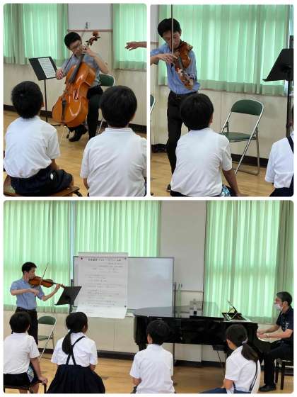 午後に、4年生がチェロとバイオリンの生演奏を鑑賞させていただきました。初めてチェロを目の前にして、とても大きく、バイオリンに比べて低い音が出るのに驚いていました、チェロの重さはどれくらいですかと質問した子に対して、5kgぐらいですとの答えに、小さいお米の袋と同じだねと聞いていました。