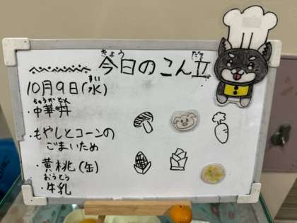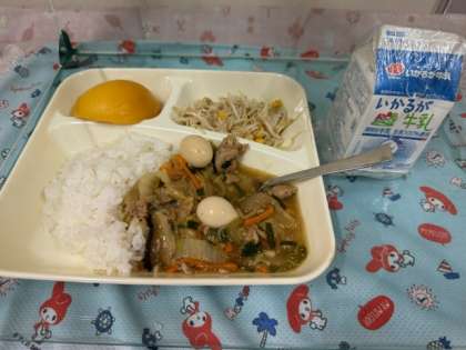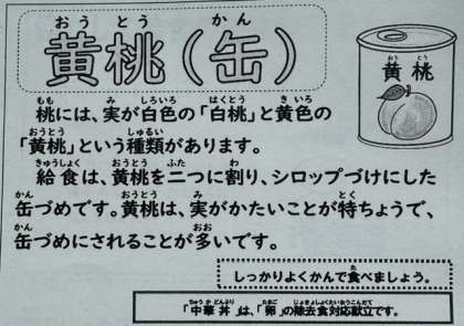 今日の献立は、中華丼・もやしとコーンのごまいため・黄桃(缶)・牛乳です。