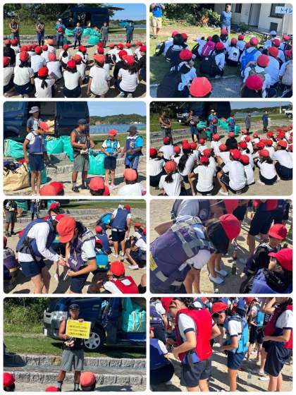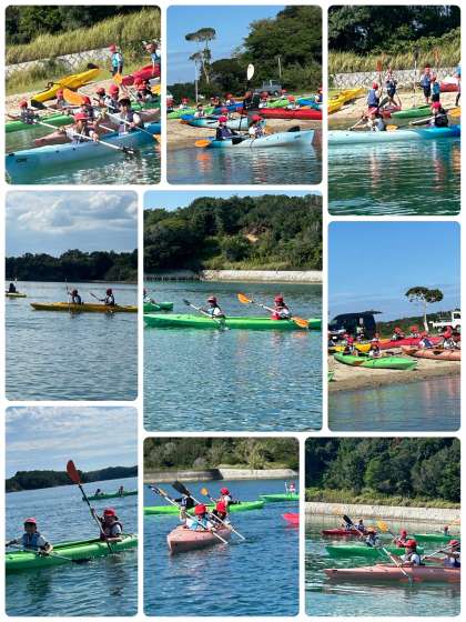 お昼を食べたら、お楽しみのシーカヤックにチャレンジです。まずはしっかり説明を聞きます。安全のため、ライフジャケットを着て乗り込みます。2人で声をかけ、操船します。