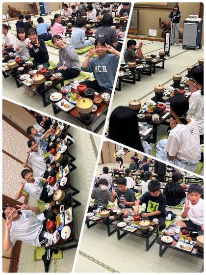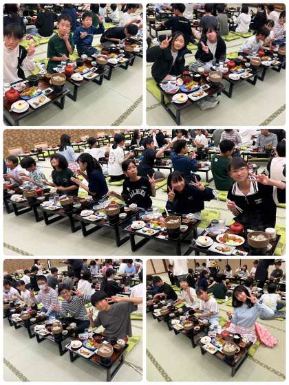 お待ちかねの夕食。豪華な食事か、美味しく、自然と笑顔になります。いい表情で食べています。