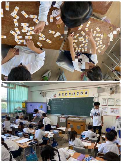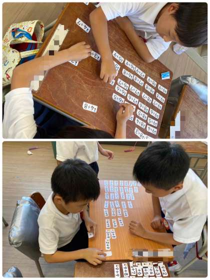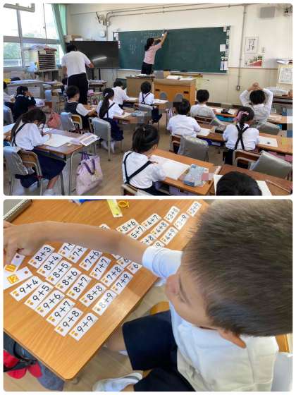 繰り上がりのあるたし算の学習をしています。10のまとまりを意識して、計算の仕方を考えます。計算カードで友だちと遊びながら、計算を習熟します。お家でも計算カードの練習をがんばりましょう。