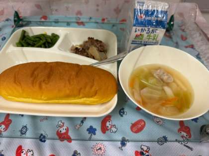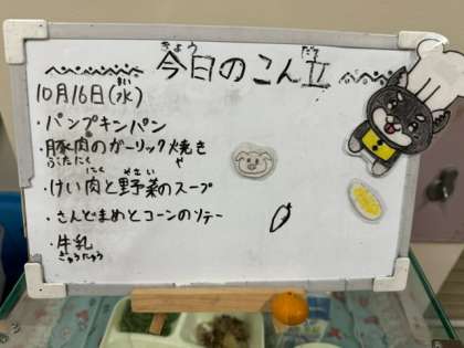 今日の給食は「豚肉のガーリック焼き・鶏肉と野菜のスープ・三度豆とコーンのソテー・パンプキンパン・牛乳」です。