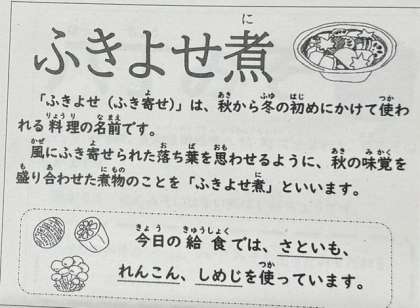 「ふきよせ煮」は風に吹き寄せられた落ち葉を思わせるように、秋の味覚を盛り合わせた料理をいいます。くり、ぎんなん、しめじ、まつたけ、もみじや松葉をかたどった生麩や野菜などが使われます。今日のふきよせ煮では、さといも、れんこん、しめじなどが使われています。