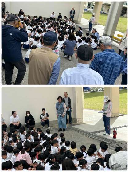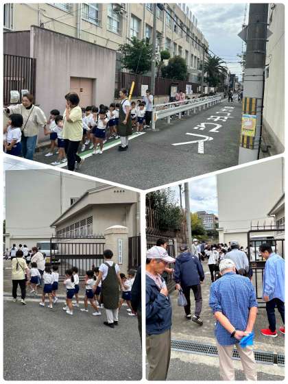 22日、東粉浜幼稚園が火事の避難訓練で小学校に避難してきました。地域の方々も協力していただき、すみやかに避難ができていました。
