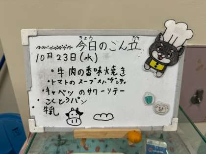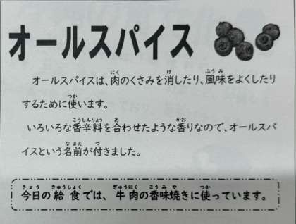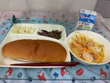 今日の給食は、「牛肉の香味焼き、トマトのスープスパゲッティ、きゅうりのサワーソテー、こくとうパン、牛乳」です。
