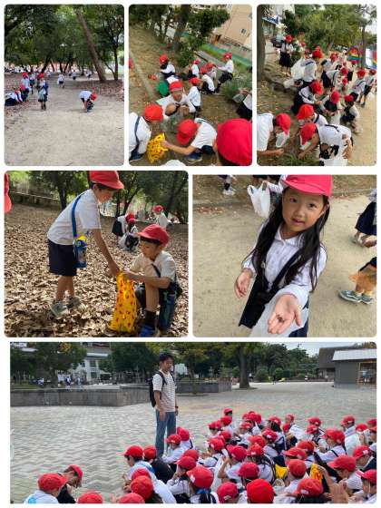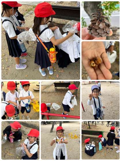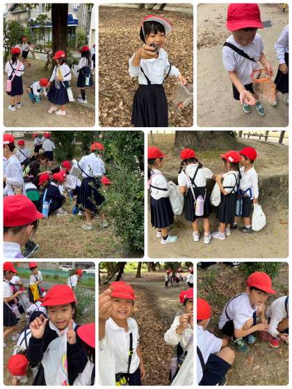 1年生が「たのしいあきいっぱい」の学習で、どんぐりや木の実、落ち葉を拾いに行きました。