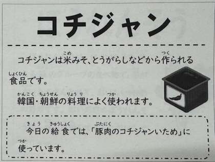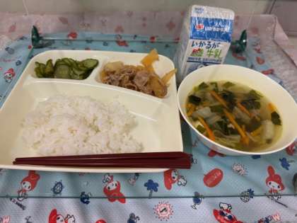 ? 今日の給食は「豚肉のコチジャンいため・鶏肉とはるさめのスープ・きゅうりのナムル・ごはん・牛乳」です。