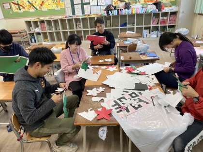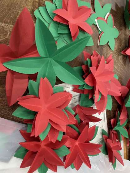 本日の研修は、12月の作品展に向けて、看板を作りました。雑談をしながら、ちょきちょき切って、折って、貼って…