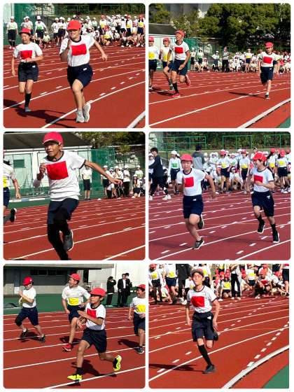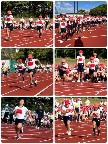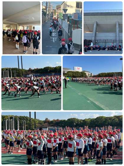 13日長居陸上競技場に、スポーツ交歓会に来ました。住吉区と住之江区から8校が参加して、100m走、4??100m走の記録を競いました。