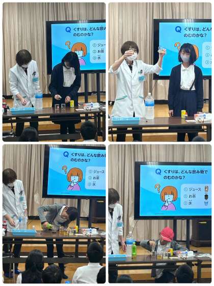薬の種類、どんな服用の仕方が良いのか、など、実験を交えながら、詳しくわかりやすく教えていただきました。