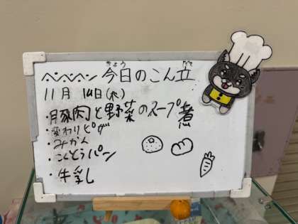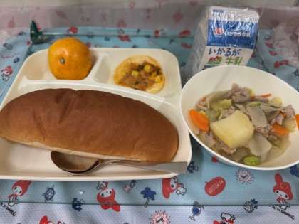 今日の給食は「豚肉と野菜のスープ煮・変わりピザ・みかん・こくとうパン・牛乳」です。