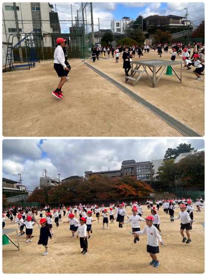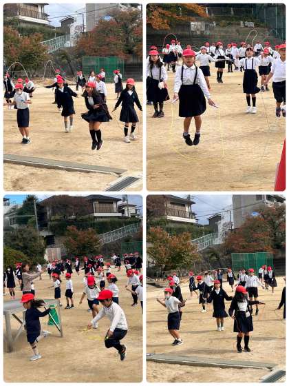3時間目の後の休憩時間には、1年、3年、6年が運動場でなわとびにチャレンジしました。
