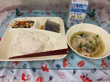 今日の給食は「さごしのごまじょうゆかけ・すまし汁・大豆の煮もの・ごはん・牛乳」です。