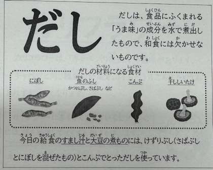 今日の献立は和食です。だしは、食品にふくまれる「うま味」の成分を水で煮だしたもので、和食には欠かせないものです。すまし汁はだしのうまみを感じさせるとともに、身体を温めてくれました。