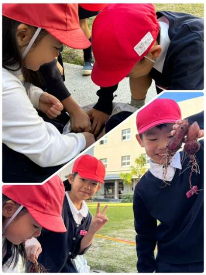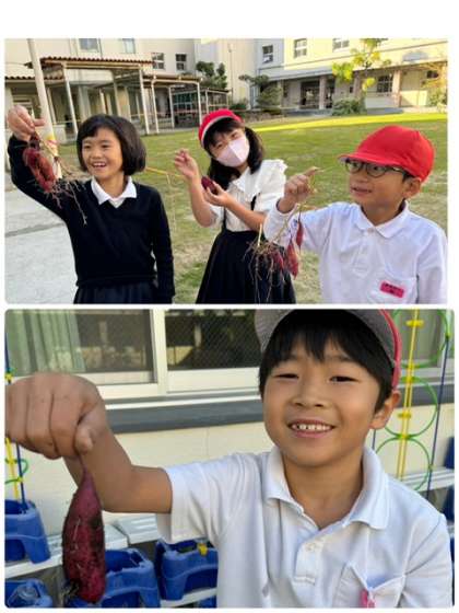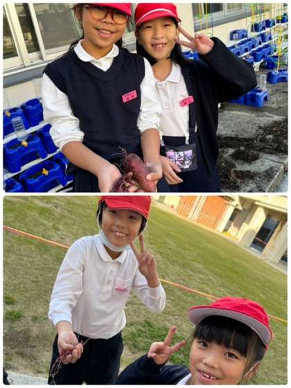 2年生では、一学期から育てていたさつまいもを収穫しました。「普段食べているものよりも硬かった」「毛が生えてる!」と気づきもたくさん見つけました。実りの秋を実感でき、「早く食べてみたい」との声もありました。次はみんなで楽しく食べてみましょう!と担任の先生からお話がありました。その日が楽しみです。