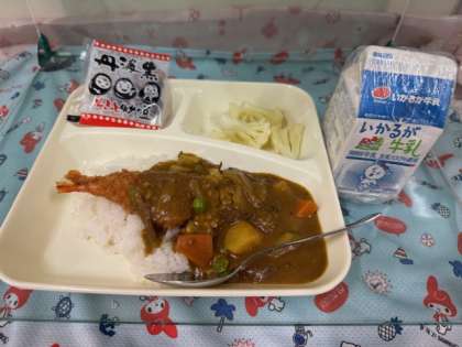 今日の給食は「えびフライカレーライス・カリフラワーのピクルス・いり黒豆・牛乳」です。