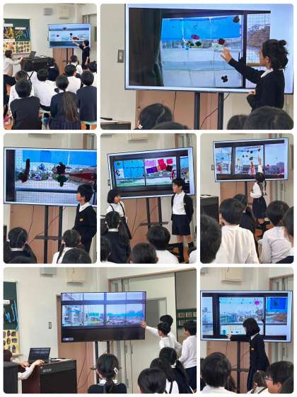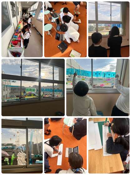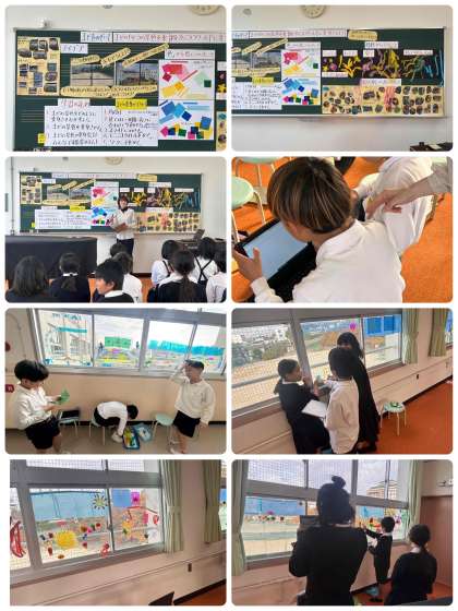 22日6時間目に、住吉区の図工主任会研究授業として、本校4年生が公開しました。窓の向こうの景色にさまざまな色や形を重ねて、新しい世界を表現していく授業でした。前時までに作ってあったものを完成させ、自分のこだわりのある角度から写真を撮り、それをみんなに説明して、最後は互いに鑑賞しあいました。少し時間が短かったので、次の時間にもう少し時間を取ることにしました。