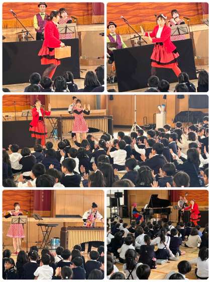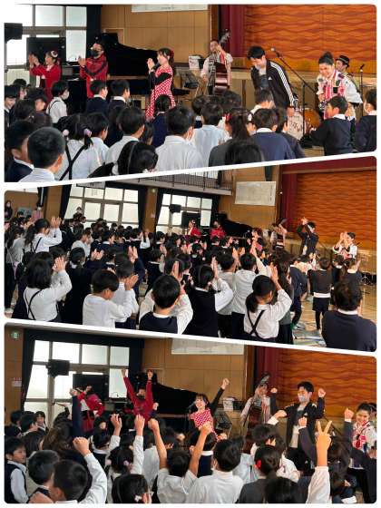 また、低学年では、ボディパーカッションを2グループに分かれてやってみました。