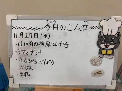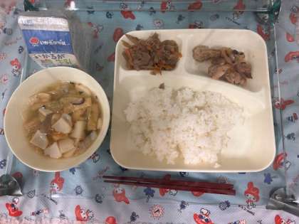 今日の給食は「鶏肉の梅風味焼き・うすくず汁・きんぴらごぼう・ごはん・牛乳」です。