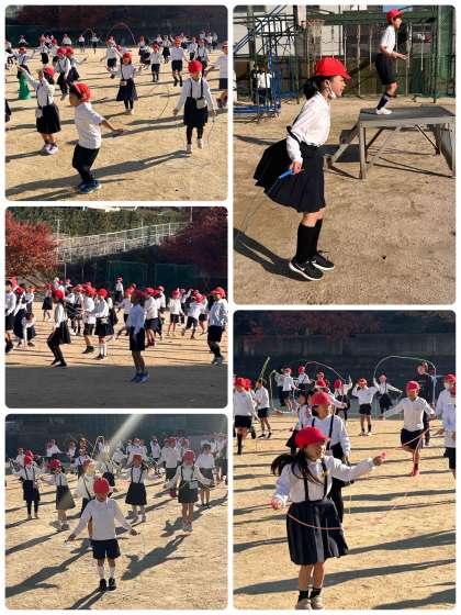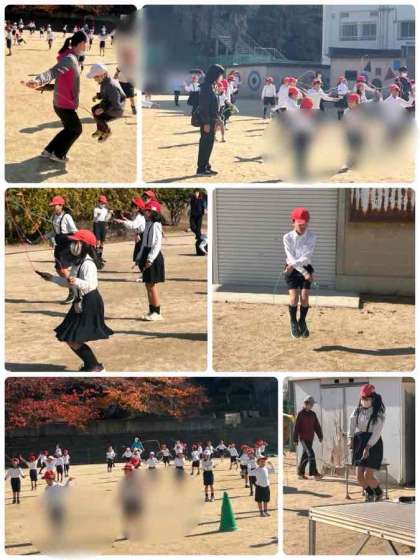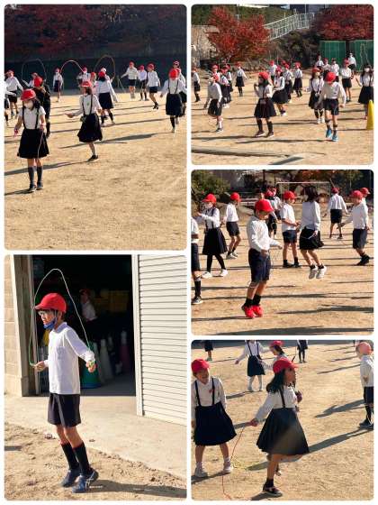 みんな一生懸命に跳んでいます。頑張りカードにたくさん塗って、なわとび名人めざしましょう!