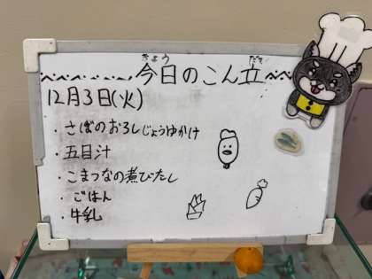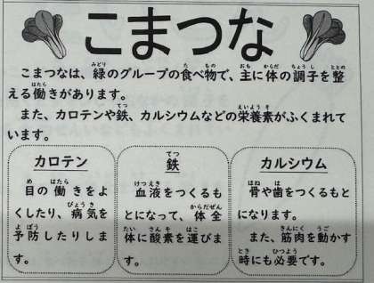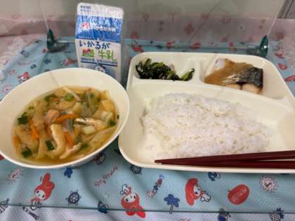 今日の給食は「さばのおろしじょうゆかけ・五目汁・こまつなの煮びたし・ごはん・牛乳」です。