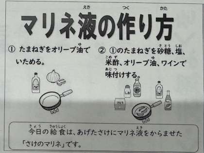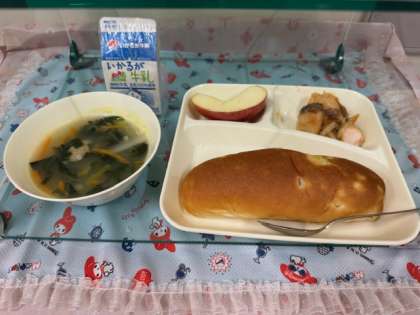 今日の給食は「さけのマリネ・肉だんごと押麦のスープ・りんご・おさつパン・牛乳」です。