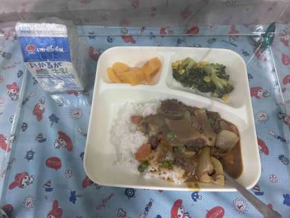 冬野菜のカレーライス、ブロッコリーとコーンのサラダ、黄桃(カット缶)、牛乳