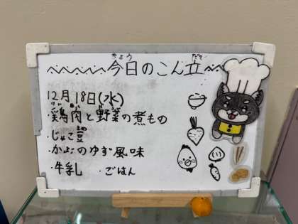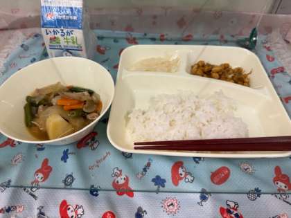 今日の給食は、「鶏肉と野菜の煮もの・じゃこ豆・かぶのゆず風味・ごはん・牛乳」です。